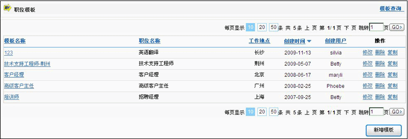 对已有的职位模板提供“修改”、“删除”以及“复制”功能。
